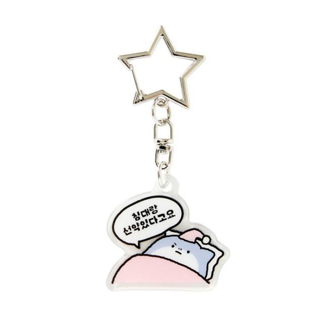 『ベッドとの先約があるんだって』 ユーモアあふれるボスのメッセージ付きアクリルキーリングです。 星の形をしたリングがポイント⭐️ イヤホンケース、筆箱、財布、カバンなどにつけてみてください! •規格:約37x35mmアクリルサイズ 商品番号【26031955】