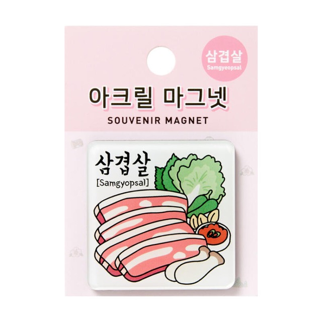 韓国人のソウルフード!サムギョプサルイラストのアクリルマグネットです。 製品の裏側に磁石が取り付けられていて冷蔵庫、玄関ドアなど磁石がつく全てのところに取り付けが可能です⭕️ 韓国の文化と観光を思い出せるように、韓国好きの方にプレゼントしてみてください! サイズ: 約 42 x 42 mm