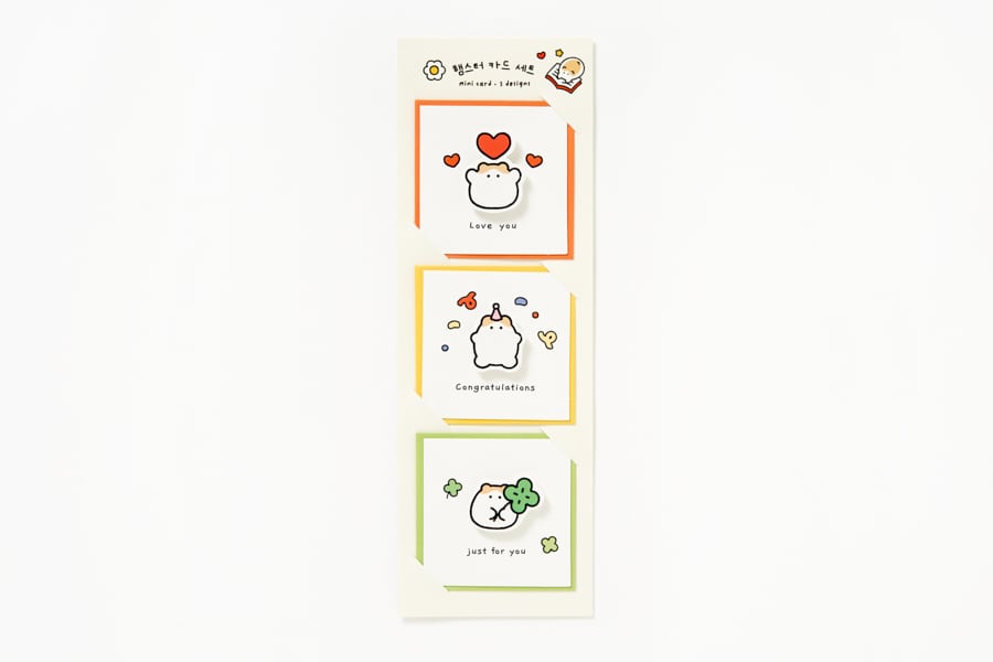 ラブリーなエンジェルとカメのオングミ、ハムスターが突出したミニカードと、パステルカラーの封筒3セットで構成されています。