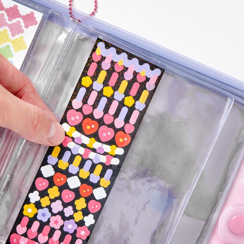 4カット写真とシールステッカーを保管できるスリムポケット24枚と、ワイド4カット写真を保管できるワイドポケット12枚で構成されています。