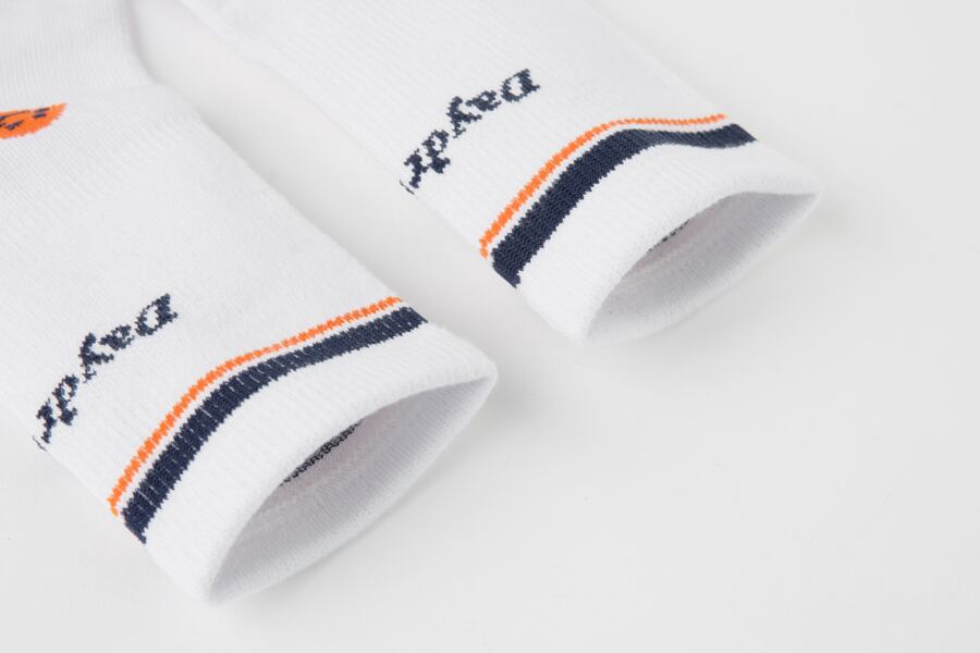 ポリエステルとポリウレタンの混用で適度な弾力性を与えたホワイトカラーのクルー丈ソックスです。
