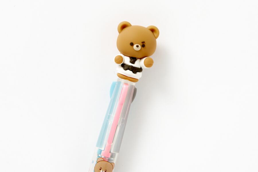 テコンドーをしているくまのフィギュアがついた3色のボールペンです。