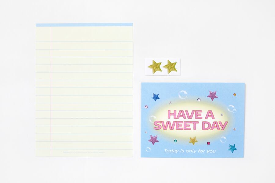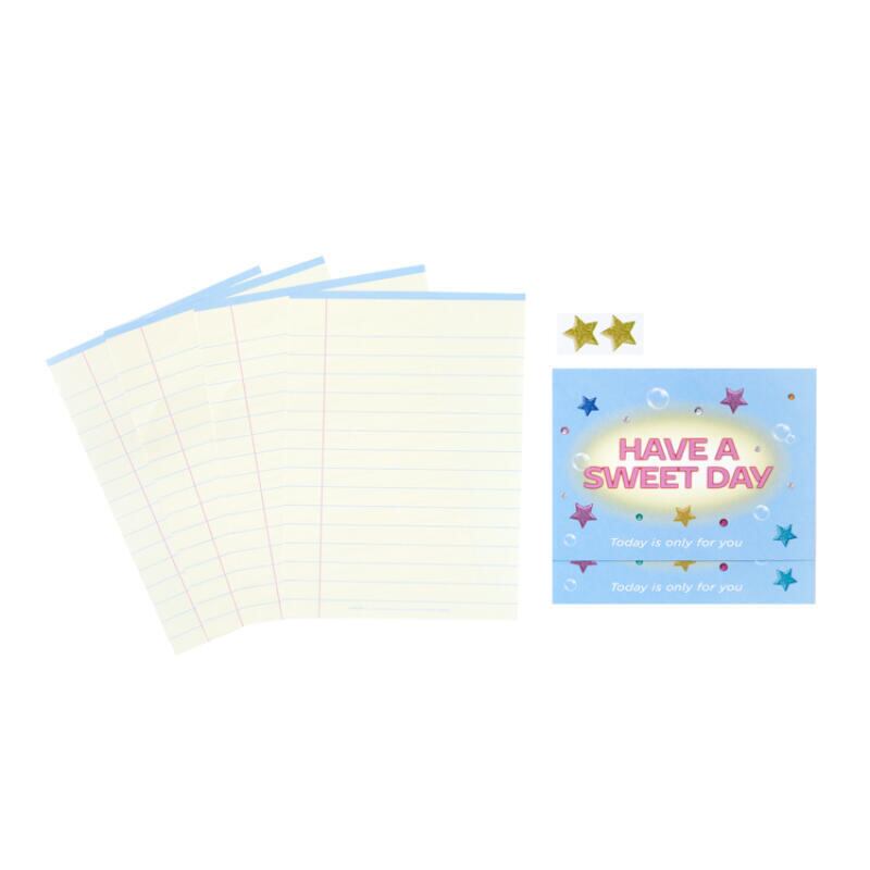 ノートスタイルの便箋4枚、封筒2枚、ステッカー1シートで構成されています✉️