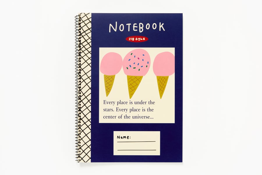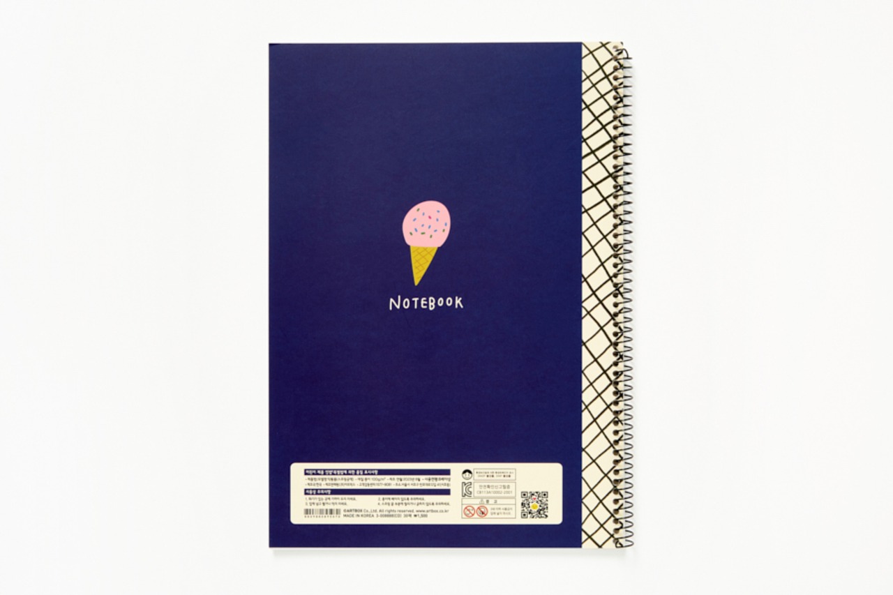 ネイビー色の背景に可愛いアイスクリームの絵がデザインされた、21行のスプリングラインノートです。