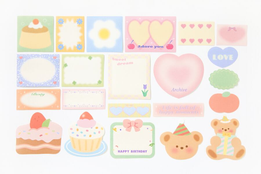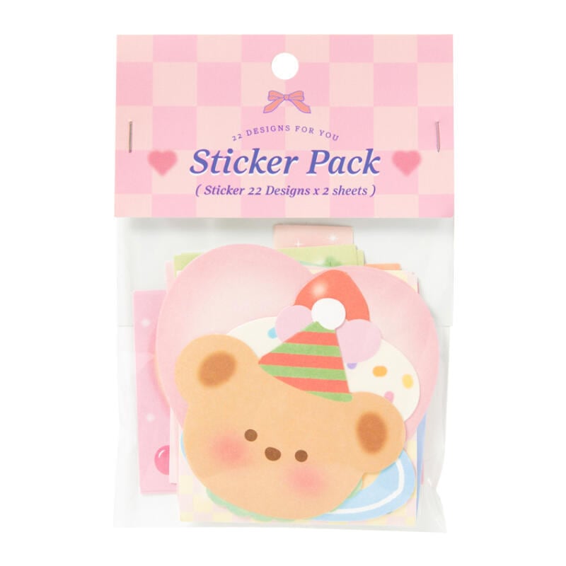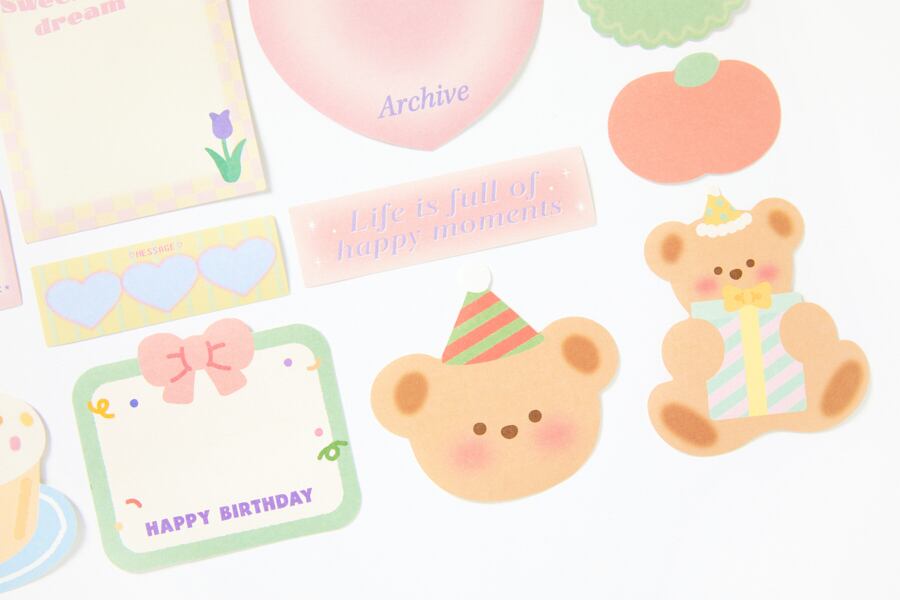 くまやケーキなどのデザインが含まれた22種類のステッカーが、2枚ずつ合計44枚入っています!