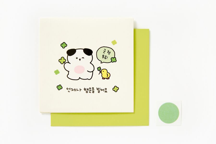 四葉のクローバーをモチーフにした元気なグラフィックと応援ミームのセリフが広がります✨