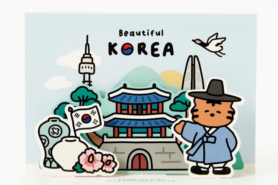 カードを開くと韓服を着た可愛い虎が様々な韓国のランドマークと太極旗、ムグンファなどの象徴物を紹介しています。