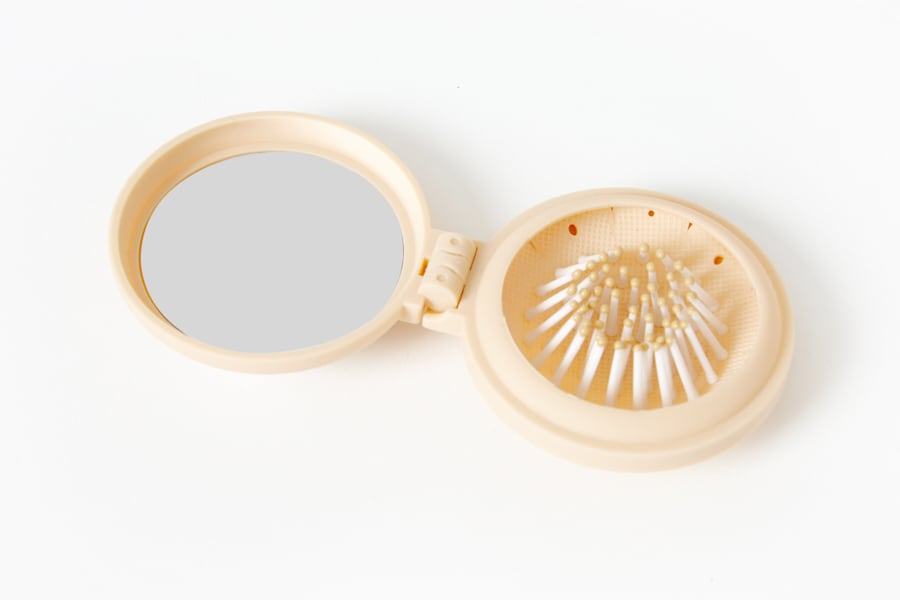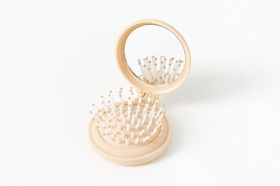 鏡とブラシが一緒になった製品で、底面をぐっと押すと櫛が出ます。