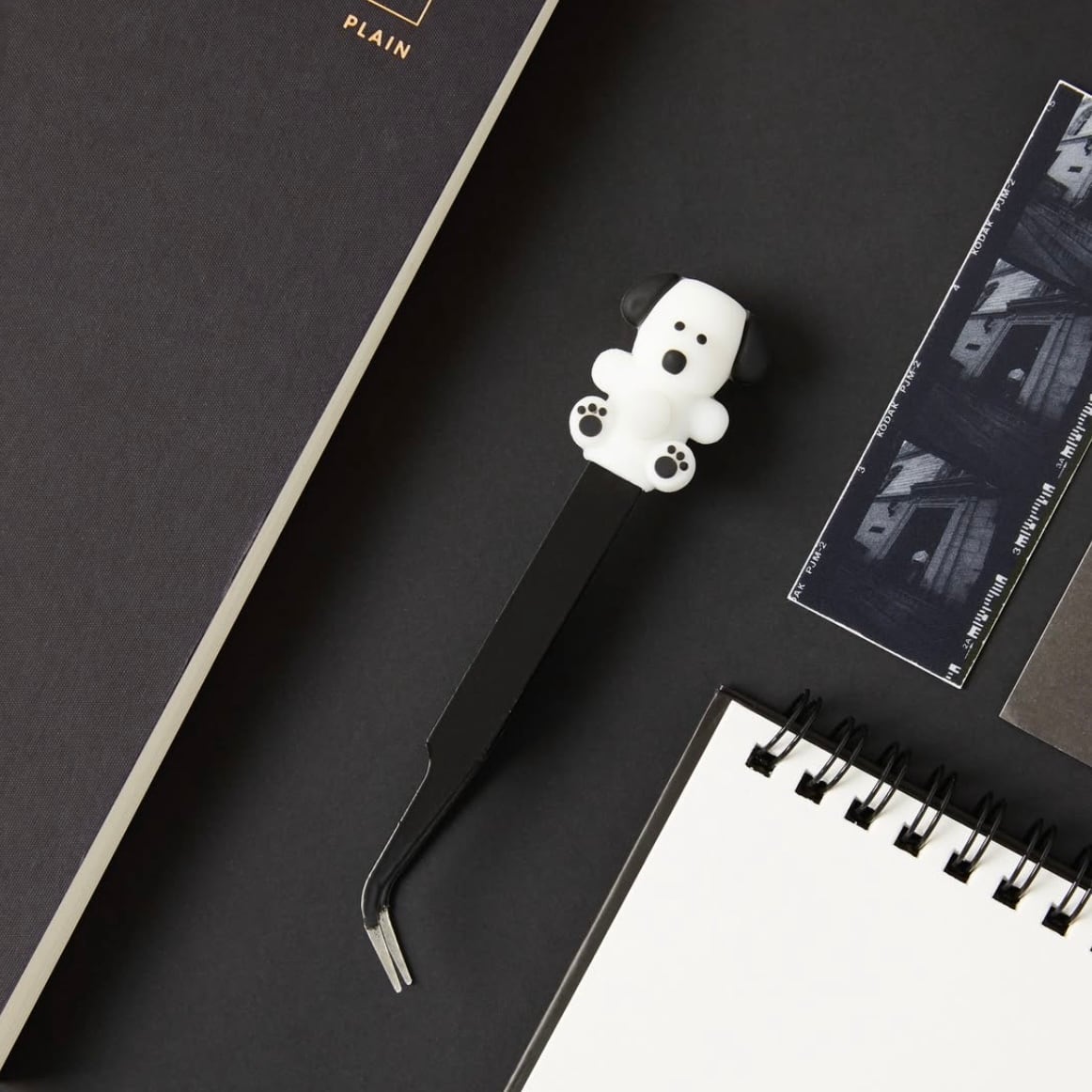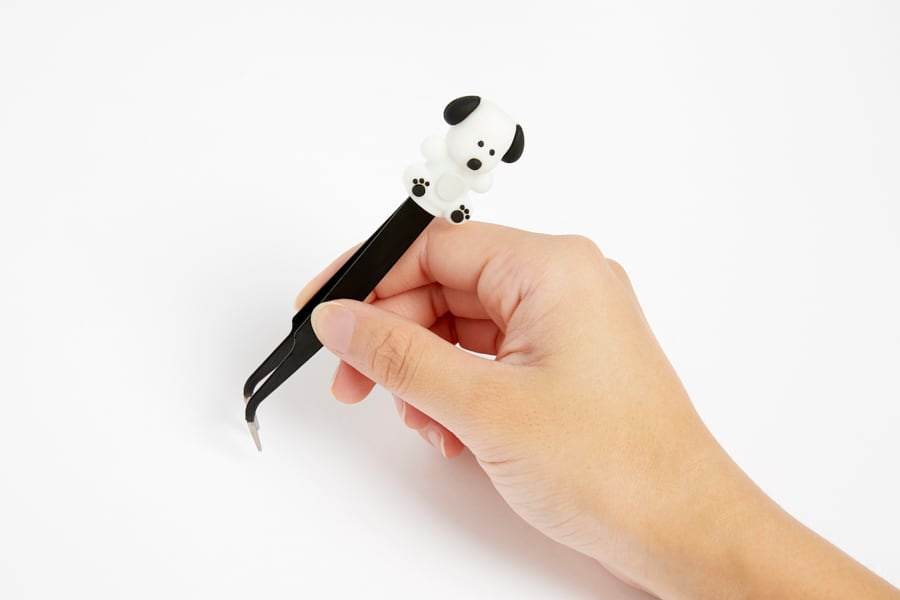 ブラックの持ち手に可愛い子犬のフィギュアがついたピンセットですU・x・U