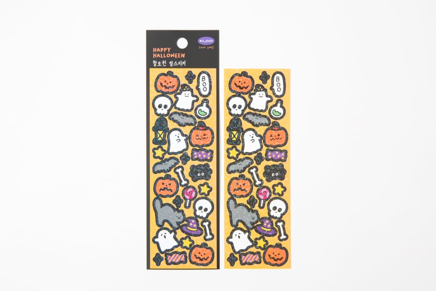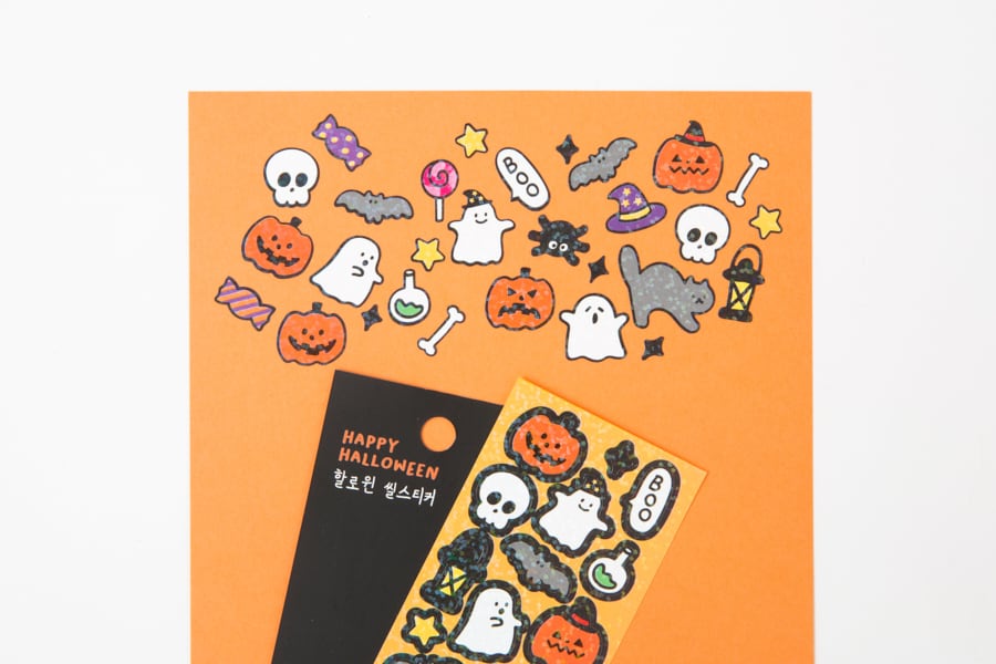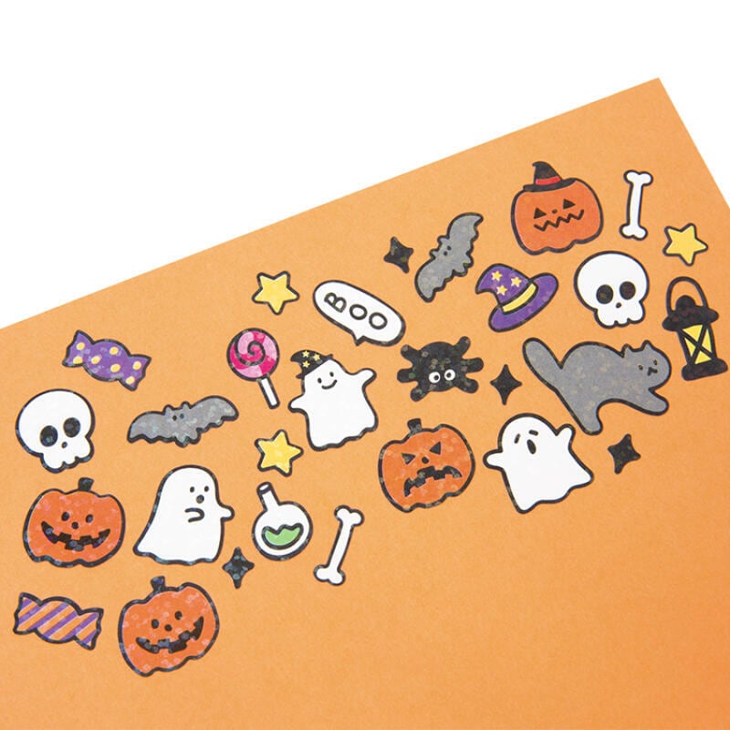 可愛らしいハロウィンの小物とおばけ、かぼちゃの友達がいっぱいのハロウィンシールステッカーです。