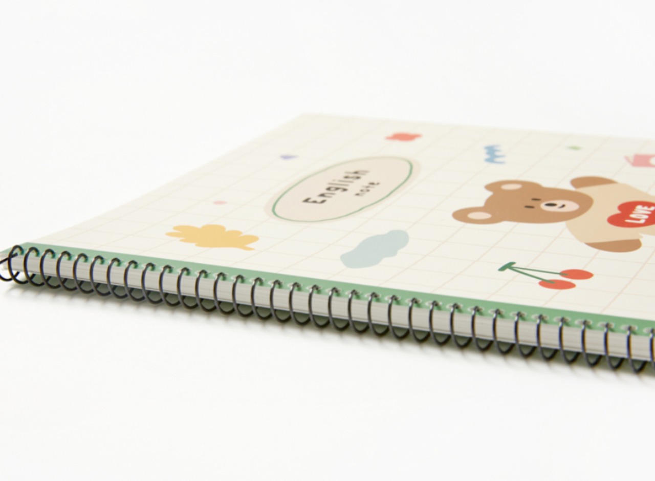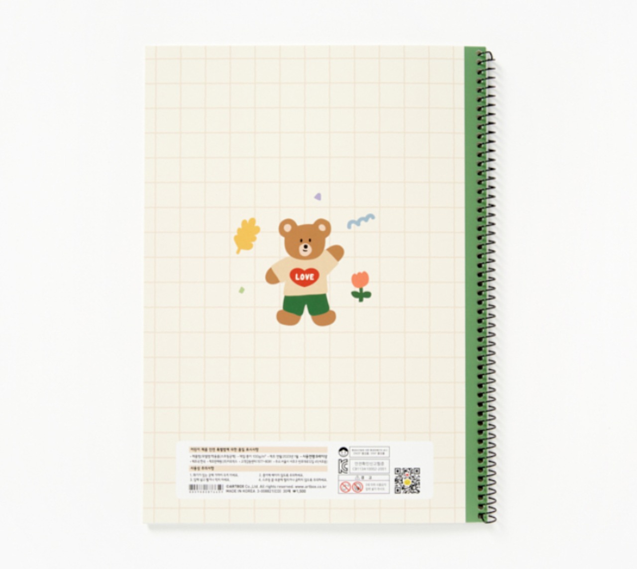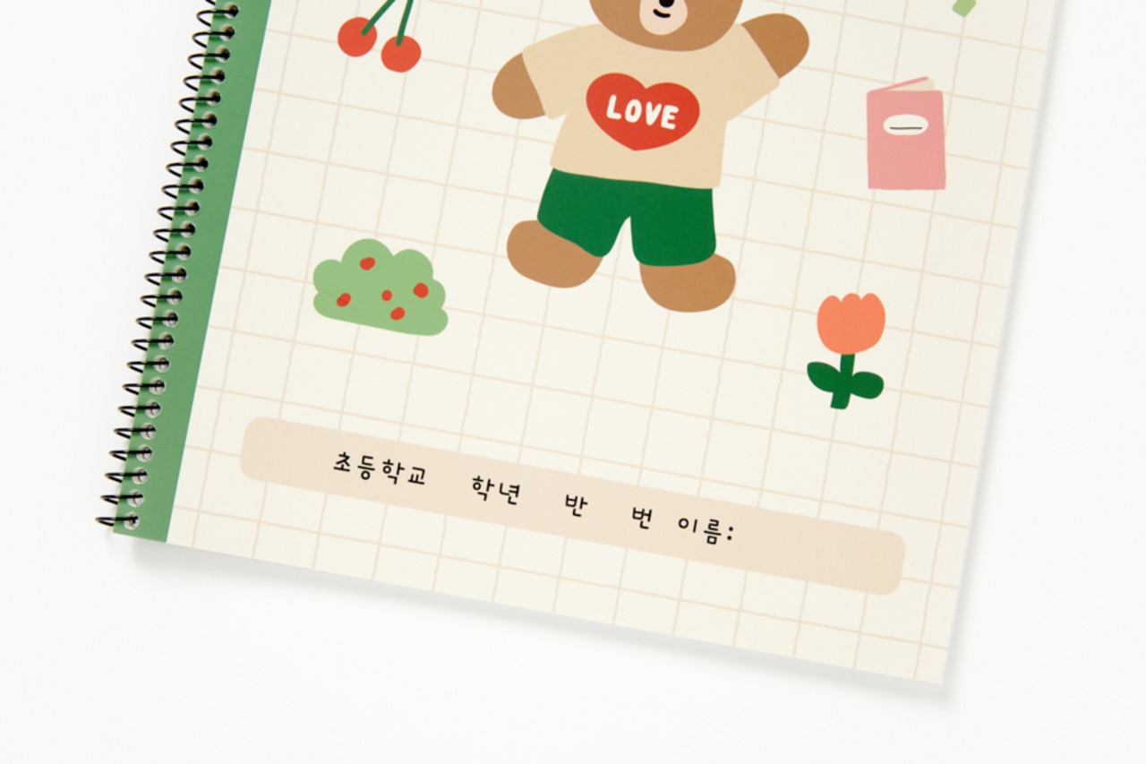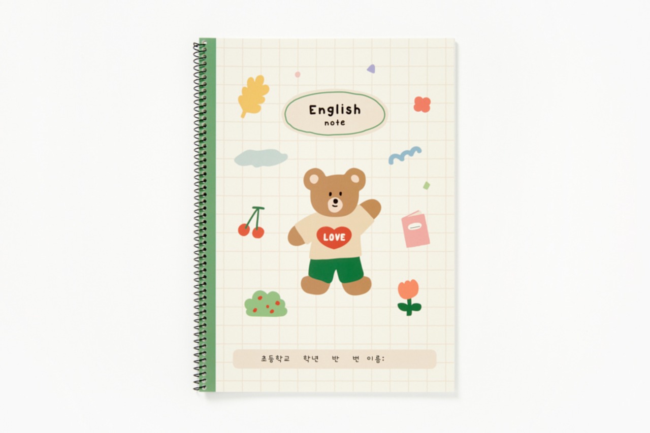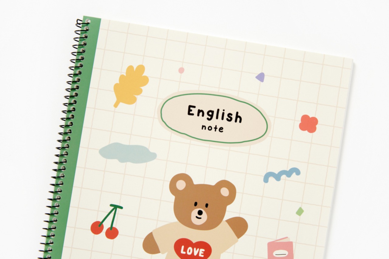 アイボリーチェックの背景に愛らしいベアグラフィックの英語ノートです。